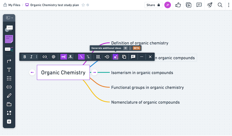 例えば、有機化学のようなトピックを入力し、AIにアプリ内でより多くのアイデアを生成するよう指示します。 すると、今後のエッセイのアウトラインや学習プランのために、複雑な概念をより小さな塊に分解するのに役立つトピックの候補がいくつか表示されます。