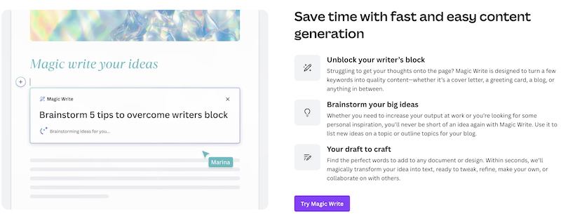 With the Canva Magic Write function, you can get help on anything from writing a more detailed birthday greeting to crafting a simple poem from a prompt within seconds. Canva can do it all.