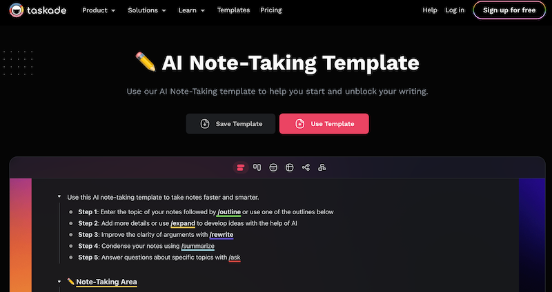 Taskade AI aims to boost your productivity through machine learning. The app includes an AI note-taking template that can help you generate an outline, expand on ideas, rewrite arguments to boost clarity, summarize your notes or even answer your questions on specific topics.