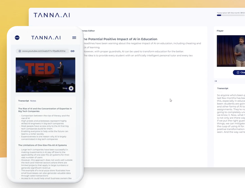 Tanna produces detailed study notes from lectures, audiobooks, and podcasts using AI. Hit play on your audio and video, and Tanna generates a written transcript while summarizing vital points in the same browser window.