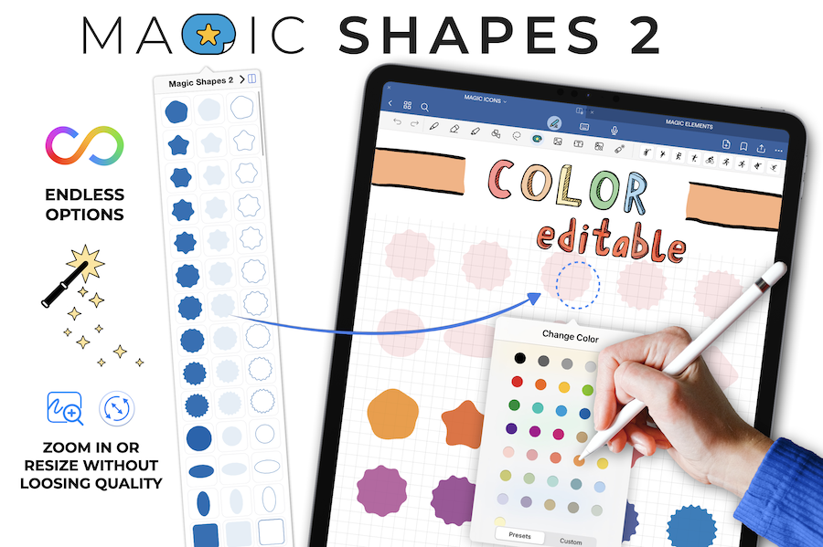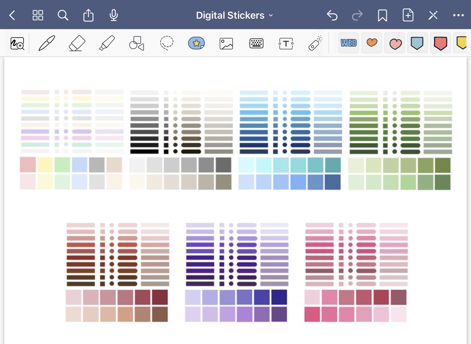 이 스티커의 "마법" 같은 요소는 무엇일까요? 기본적으로, 사용자는 Goodnotes에서 곧바로 스티커의 색상을 변경할 수 있습니다. 즉, 14가지 도형으로 구성된 스티커 팩 하나만 있으면 모든 색상으로 해당 14가지 도형을 사용할 수 있습니다.