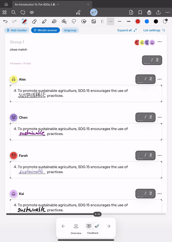 Goodnotes Classroom has a built-in AI grading assistant that can help you cluster your student answers in a way which allows you to give feedback faster and get insights on how well your students understand a topic. Open the Smart View “by Question” to find the Smart Cluster option at the top left. Here you can cluster your student answers according to how closely they match a provided model answer.