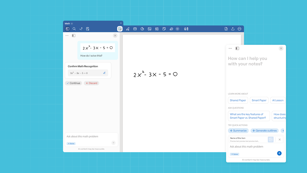 Goodnotes AI for Math is created specifically for students, and acts as your 24/7 personal math tutor. You can use the quick actions "Solve" when you're stuck on a equation and need the next steps, and "Teach me" when you need more detailed explanations to help you understand.