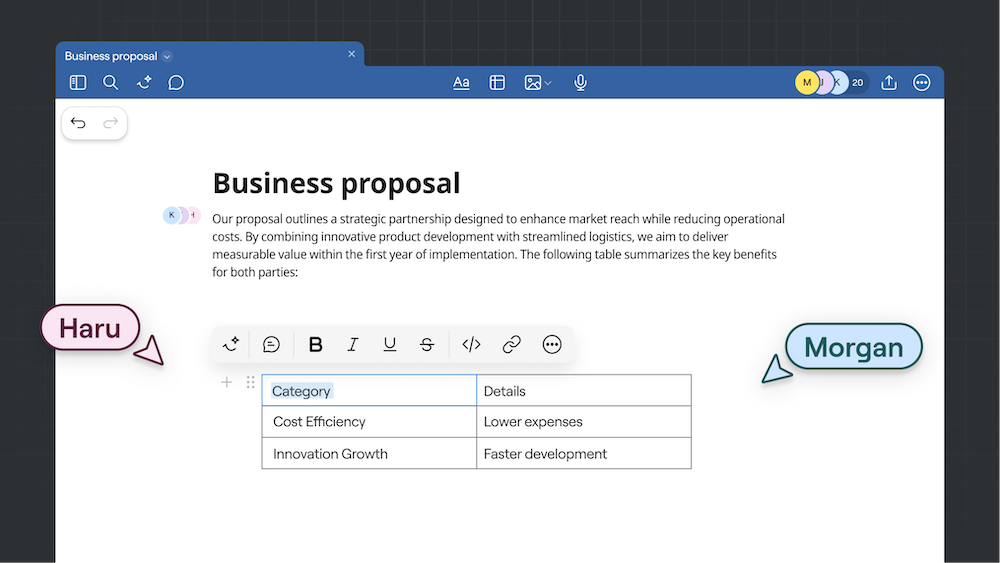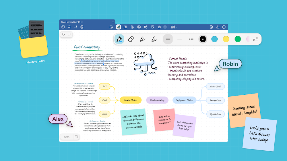Whether you're brainstorming with colleagues or working through a project with classmates, the new Goodnotes makes collaboration seamless. See each other's contributions appear in real-time across all Notebooks, Whiteboards, and Text Documents. Leave comments, see where teammates are working, and watch ideas develop together naturally.
