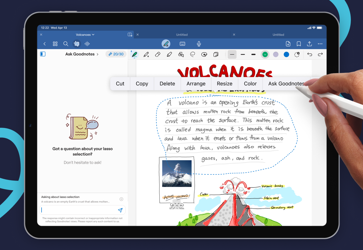 - Lasso tool to select a specific passage, then select Ask Goodnotes